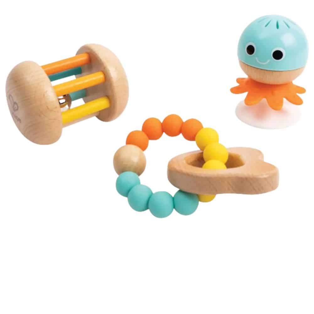 Tässä setissä on kolme erilaista lelua, jotka antavat pienille leikkijöille paljon ihmettelemisen aihetta. Mustekalassa on imukuppi, jolla sen saa kiinni tasaiselle alustalle, eikä siten pääse karkaamaan. Helistin on varustettu kulkusella. Purulelu helpottaa kutisevia ikeniä.