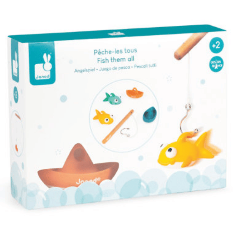 - Janod kalastajan kylpylelu setti sisältää koukullisen ongen, kaksi kalaa ja kaksi venettä. Kalasta koukulla hahmojen päällä olevista rei’istä. Kylpylelujen rungoista painamalla ne sylkevät vettä.