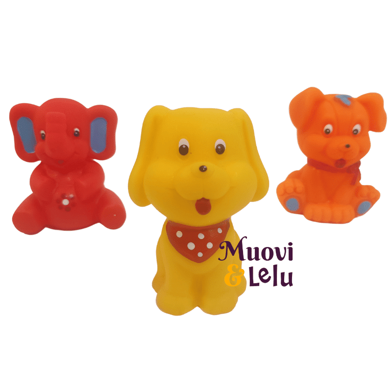 Veikeät eläinkylpylelut kylpyhetkien iloksi. Pakkaus sisältää kolme erilaista kylpyleluhahmoa: norsun ja kaksi eri väristä koiraa. Hahmojen koko on noin 8-10 cm. Kylpyleluja on hauska ja helppoja pidellä. Kehittää koordinaatiota.