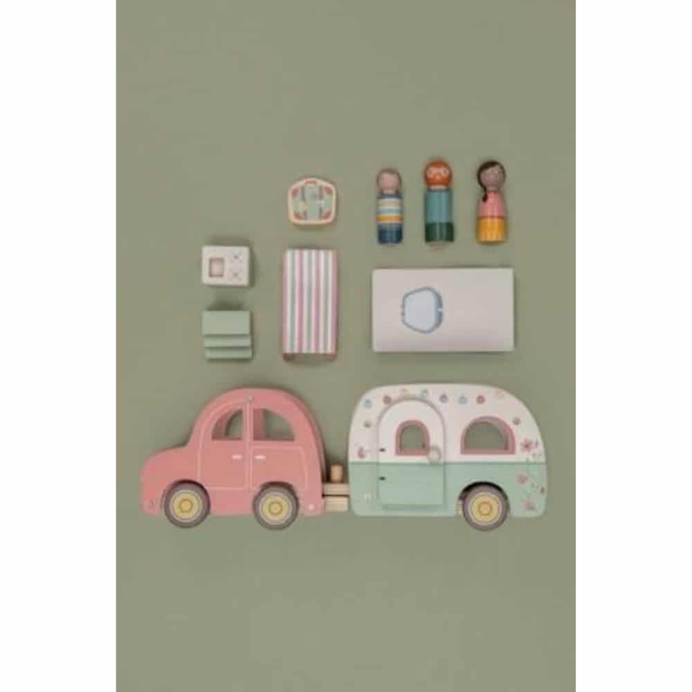 Pastellin sävyinen puinen leikkiauto ja asuntovaunu, jonka mukana caravaanaritavaroita sekä kolme matkustajaa. Hienon näköinen ja kauniin värinen leikkiauto ja asuntovaunu on valmistettu laadukkaasta puusta. Lelu kehittää lapsen hienomotorisia taitoja sekä koordinaatiokykyä. Ikäsuositus: yli puolitoista vuotiaille lapsille.