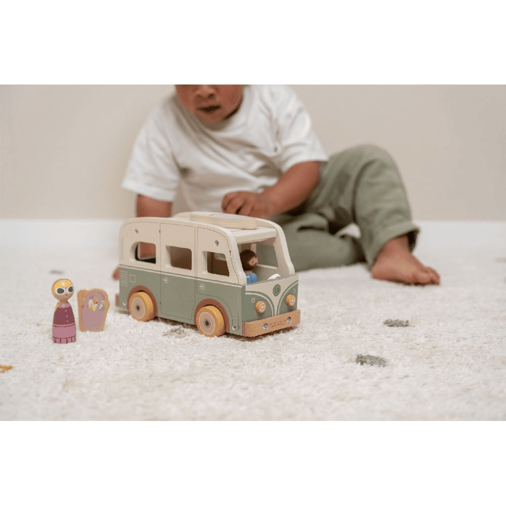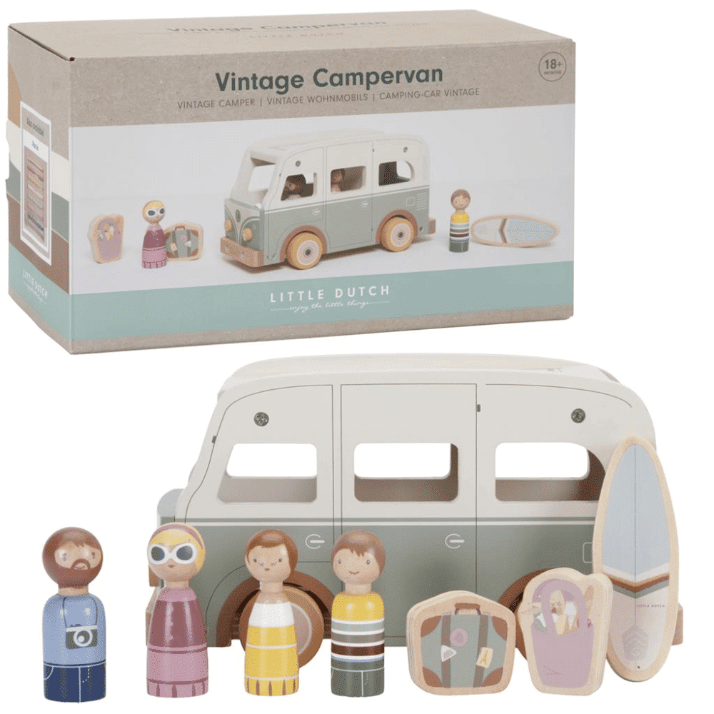 Auto Little Dutch Campervan on pastellin sävyinen puinen leikkimatkailuauto, jonka mukana tulee matkatavaroita sekä neljä matkustajaa.