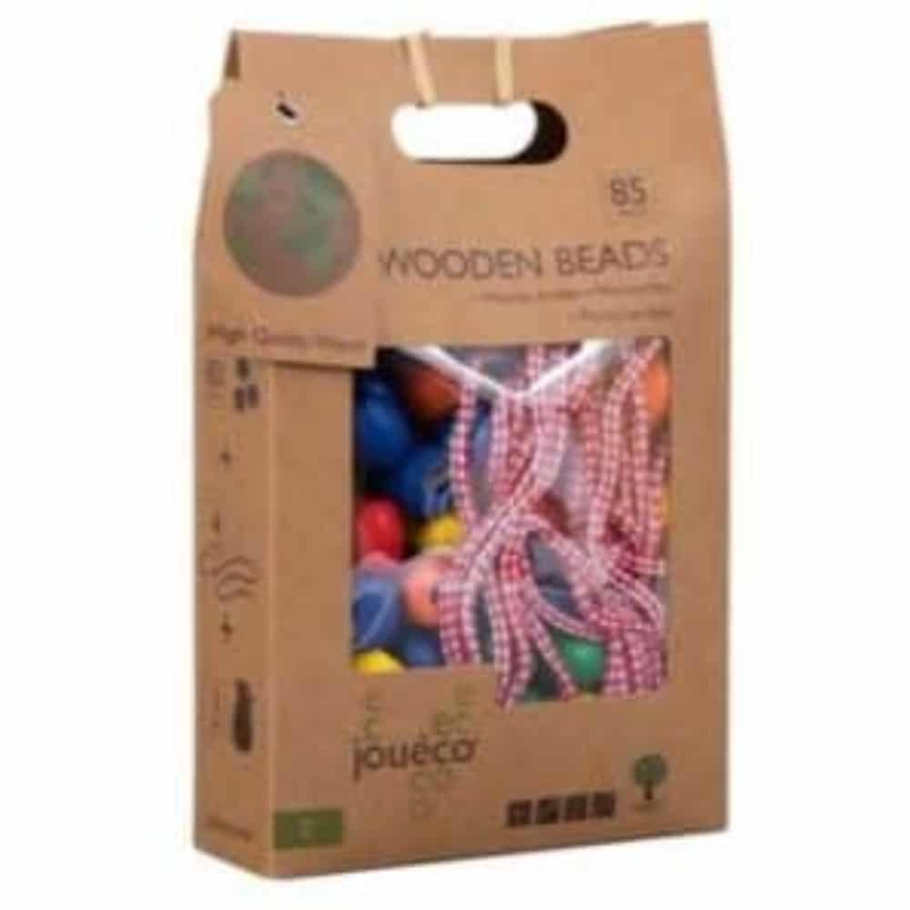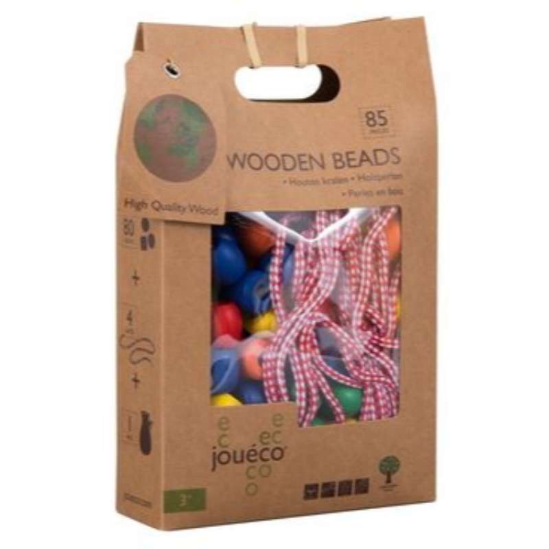 Sisältää 80 puista helmeä, 4 narua, 1 kangaspussi.
