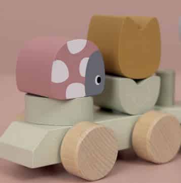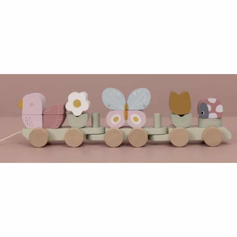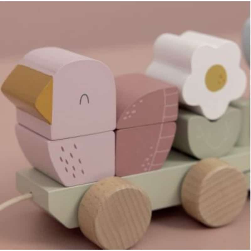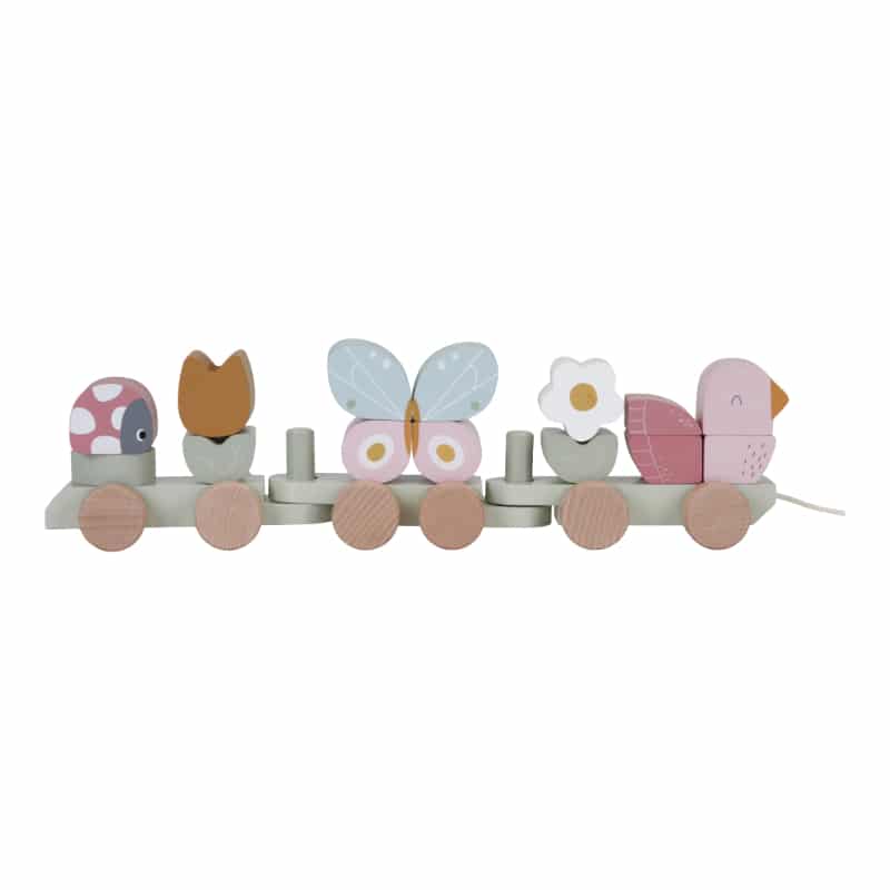 Little Dutch puujuna on monipuolinen lelu. Junan kyydissä on vaaleanpunainen lintu ja kaksi vaunua sekä perhonen, kukkia ja leppäkerttu. useita pienempiä osia, jotka voit kasata vaunuihin kyytiin. Palat ovat eri muotoisia ja eri värisiä. Lelulla leikkiminen ja palojen kiinnittäminen toisiinsa kehittää lapsen motorisia taitoja Junassa on alla renkaat ja se pysyy tukevasti pystyssä. Lintu, perhonen, leppäkerttu ja kukat ovat valmiita seikkailuun. Oletko sinäkin? Vaunun päässä on naru, jolla voi vetää lelua. Ikäsuositus: 1,5 vuotta. Valmistuttu 100%:sti vastuullisesti tuotetusta puusta.