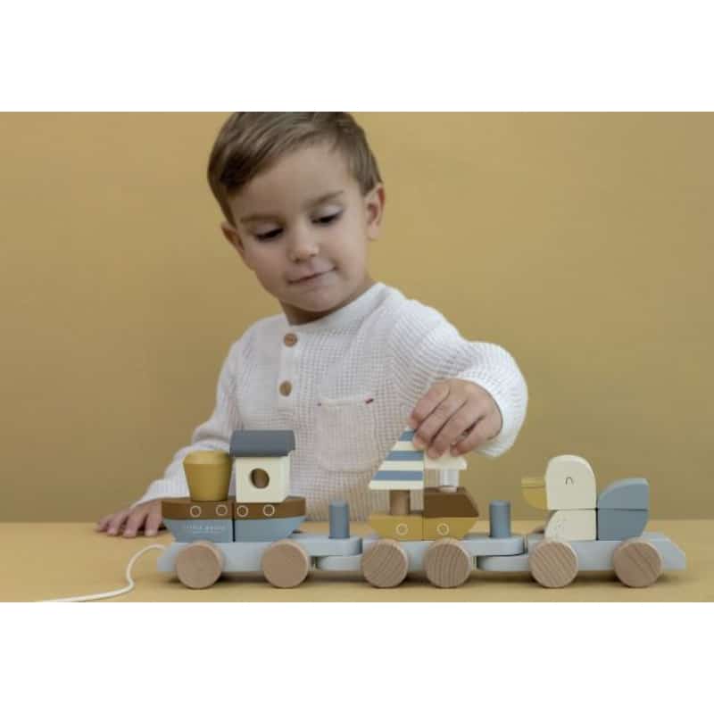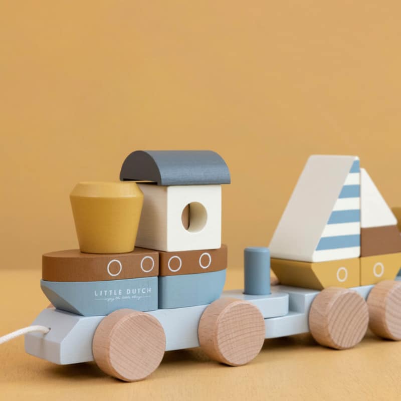 Little Dutch puujuna on monipuolinen ja kehittävä lelu puolitoista vuotiaille lapsille. Junassa on laiva, kaksi vaunua sekä purjevene ja ankka, jotka voit kasata vaunuihin kyytiin. Palat ovat eri muotoisia ja eri värisiä. Lelulla leikkiminen ja palojen kiinnittäminen toisiinsa kehittää lapsen motorisia taitoja. Junan alla on renkaat ja se pysyy tukevasti pystyssä. Laiva, purjevene ja lokki ovat valmiita seikkailuun. Oletko sinäkin? Vaunun päässä on naru, jolla lelua voit vetää junaa ja sen kyyditsijöitä. Ikäsuositus: 1,5 vuotta. Valmistuttu 100%:sti vastuullisesti tuotetusta puusta.