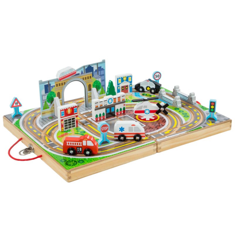 - Sisältää: Salkku, joka muuttuu leikkialustaksi, puiset leikkiosat, joihin kuuluu kaupunkirekvisiittaa, tunneli, silta, liikennemerkkejä ja ajoneuvoja.