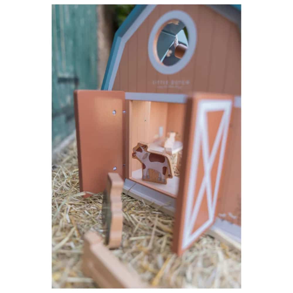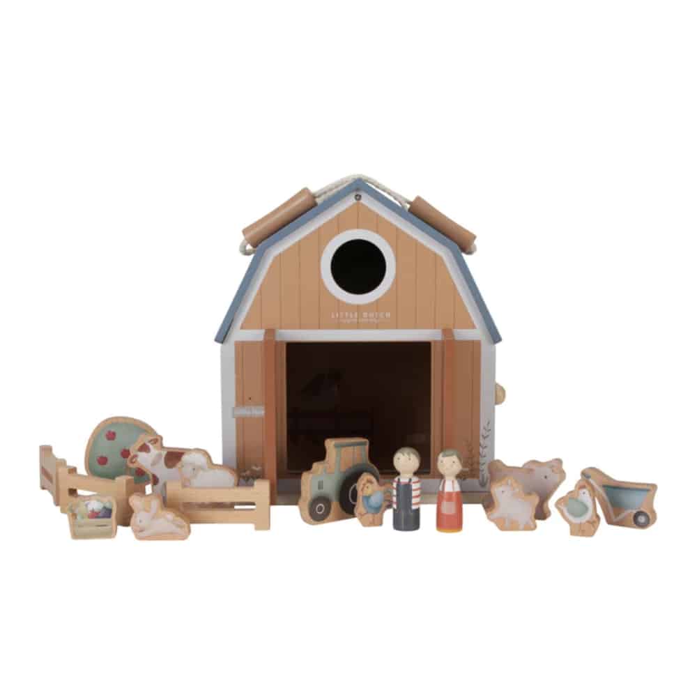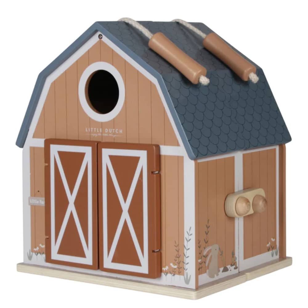 Maatila Little Dutch puinen Pakkaus sisältää puisen maatilan, kaksi hahmoa, eläimiä sekä muita tarvikkeita. Maatilaa voi kuljettaa kätevästi kattoon kiinnitetyistä kantonaruista.