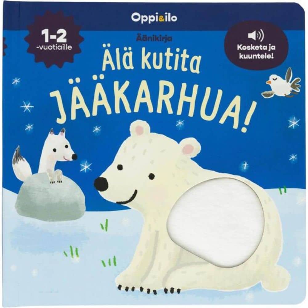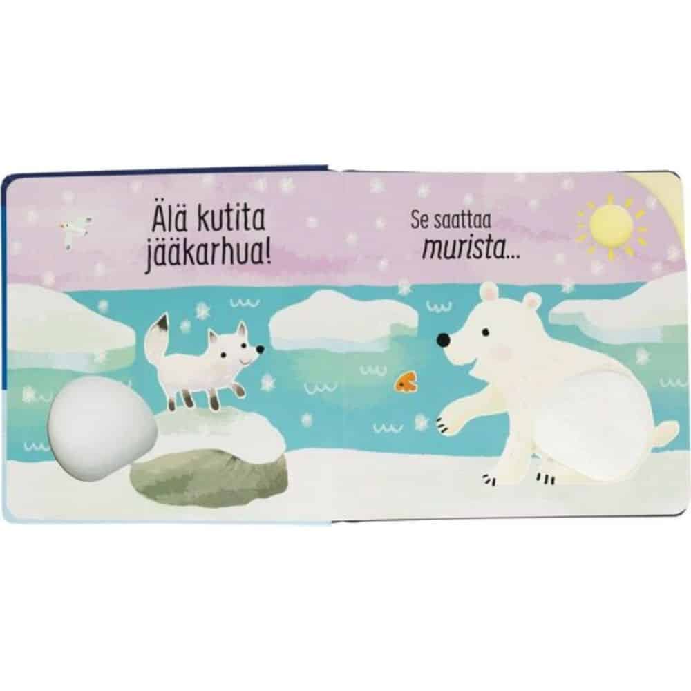Älä kutita jääkarhua, se saattaa murista! Oppi&ilo Älä kutita jääkarhua on ihana ensikirja pienokaiselle. Kirjan pehmeät tunnustelupinnat houkuttelevat silittämään napapiiriltä tuttuja eläinhahmoja. Kutitus saa eläimet ääntelemään. Kuuntele miten eläimet kikattavat ja hekottavat, kun kutitat niitä. Kirjassa on värikkäät kuvat ja paljon tutkittavaa. Kirjan äänipainikkeet ja kurkistusaukot jaksavat kiinnostaa taaperoa lukukerrasta toiseen!