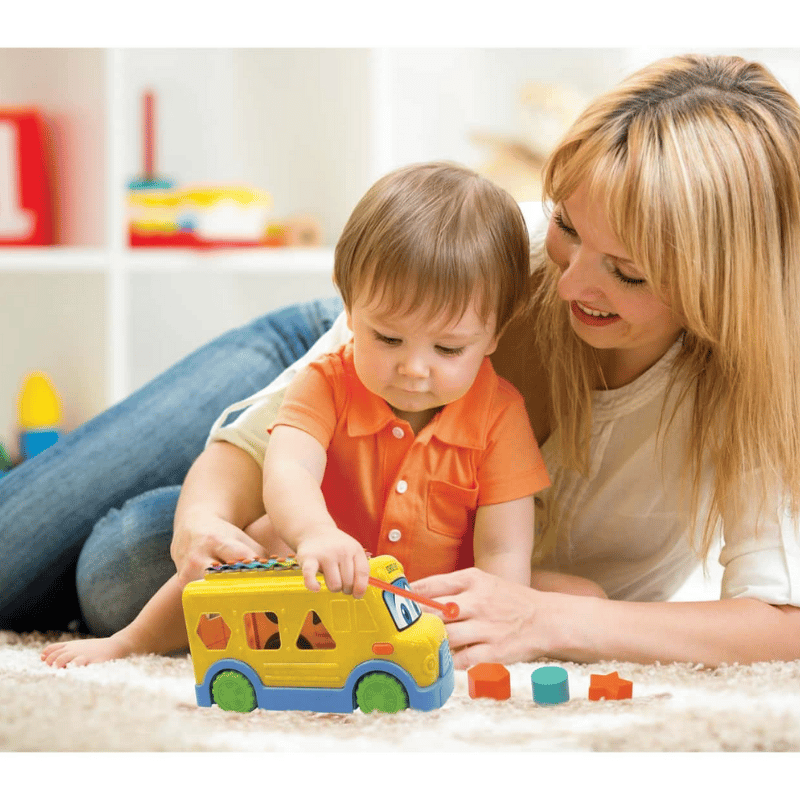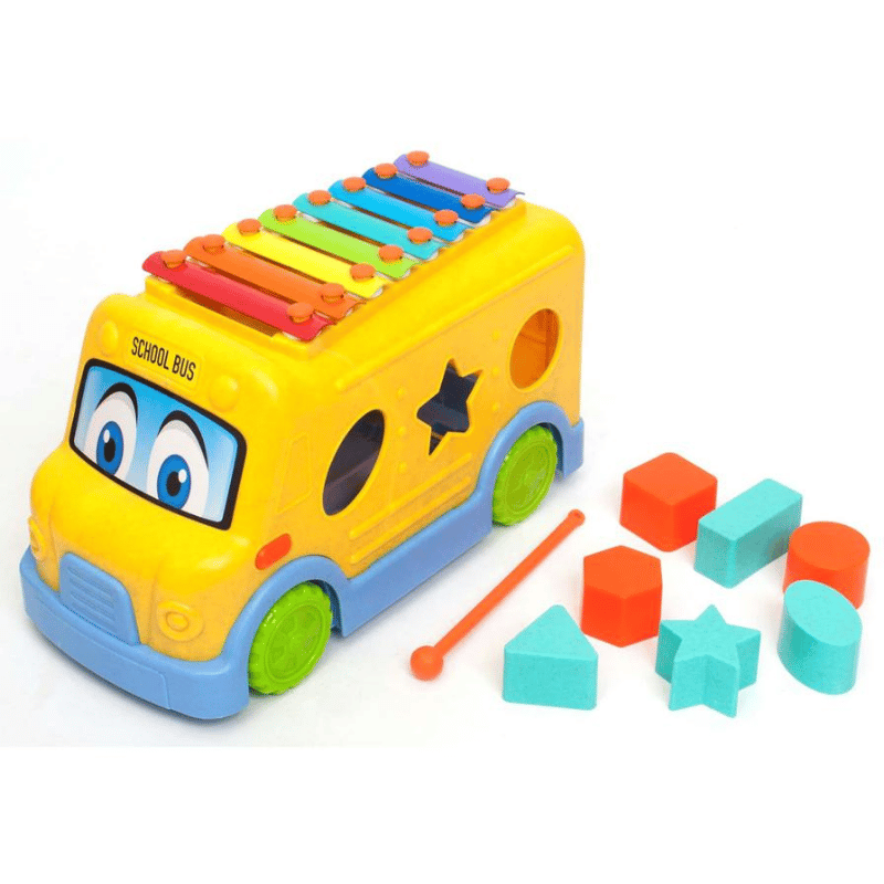 Pääosin kierrätysmateriaaleista valmistettu monipuolinen lelu onkin itse asiassa kolme lelua yhdessä: xylofoni, palikkalaatikko ja leluauto! Linja-auton katolla on värikäs xylofoni, jolla lapsi voi harjaannuttaa sävelkorvaansa. Bussin kyljessä on kolot, joihin pieni käsi voi sovitella erimuotoisia palikoita yhä uudestaan. Palikat on helppo kerätä bussin takaovien kautta, jonka jälkeen täytyy tietysti taas kokeilla, josko ympyrä tällä kertaa mahtuisi soikiosta reiästä? Tietysti bussin kanssa voi myös huristella ja leikkiä vaikka muuttoautoa, joka kuljettaa palikoita paikasta toiseen.