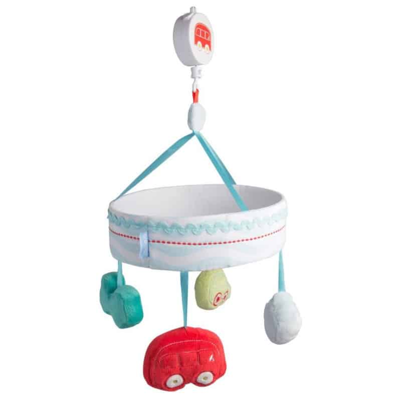 - Sinisävyisessä All Aboard mobilessa neljä erilaista pehmoajoneuvoa