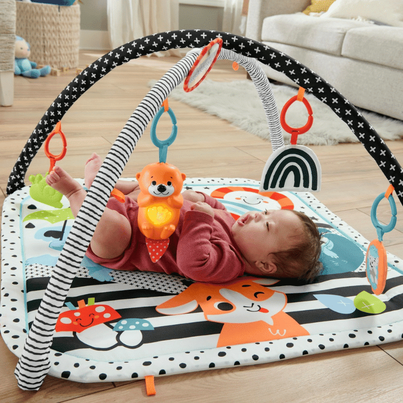 Leikkimatto Fisher-Price 3-in-1 Grow Gym, jossa on kolme tapaa leikkiä; kuuntele musiikkia, loista leikissä omalla matolla ja kasvaessasi vahvista lihaksia. Mukana tulee viisi lelua: rapiseva sateenkaari, helisevä siili, peili, pureskeltava etana ja saukko, joka soittaa 15min pituista sävelmää ja loistaa pehmeästi hehkuvaa valoa. Leikkimatto tukee vauvan eri aisteja.