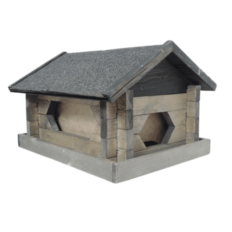 Kaunis, reilunkokoinen lintulauta, jonka pohjareikä mahdollistaa helpon kiinnityksen tolpan nokkaan. Materiaalina harmaaksi sävytetty puu, katto päällystetty tummanharmaalla, karhealla huovalla.