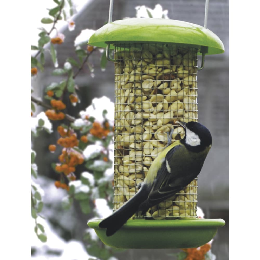 Lintulauta pähkinäautomaatti muovi/metalli. Ruoki lintuja tällä pähkinäautomaatilla. Automaatti on täytetään alaosan kautta. Pohjassa on vedenpoistoreiät.