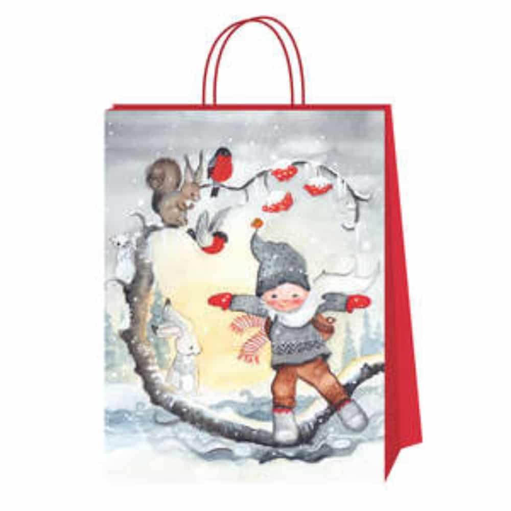 Joululahjakassi 31x23x10 cm tonttu ja eläimiä – Suomessa valmistettu Linnapaperin joululahjakassi söpöllä kuvituksella. Huom. Kassi on todellisuudessa paremman näköinen ja sävyinen kuin kuvassa.