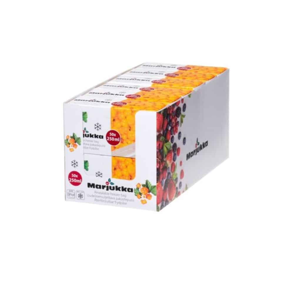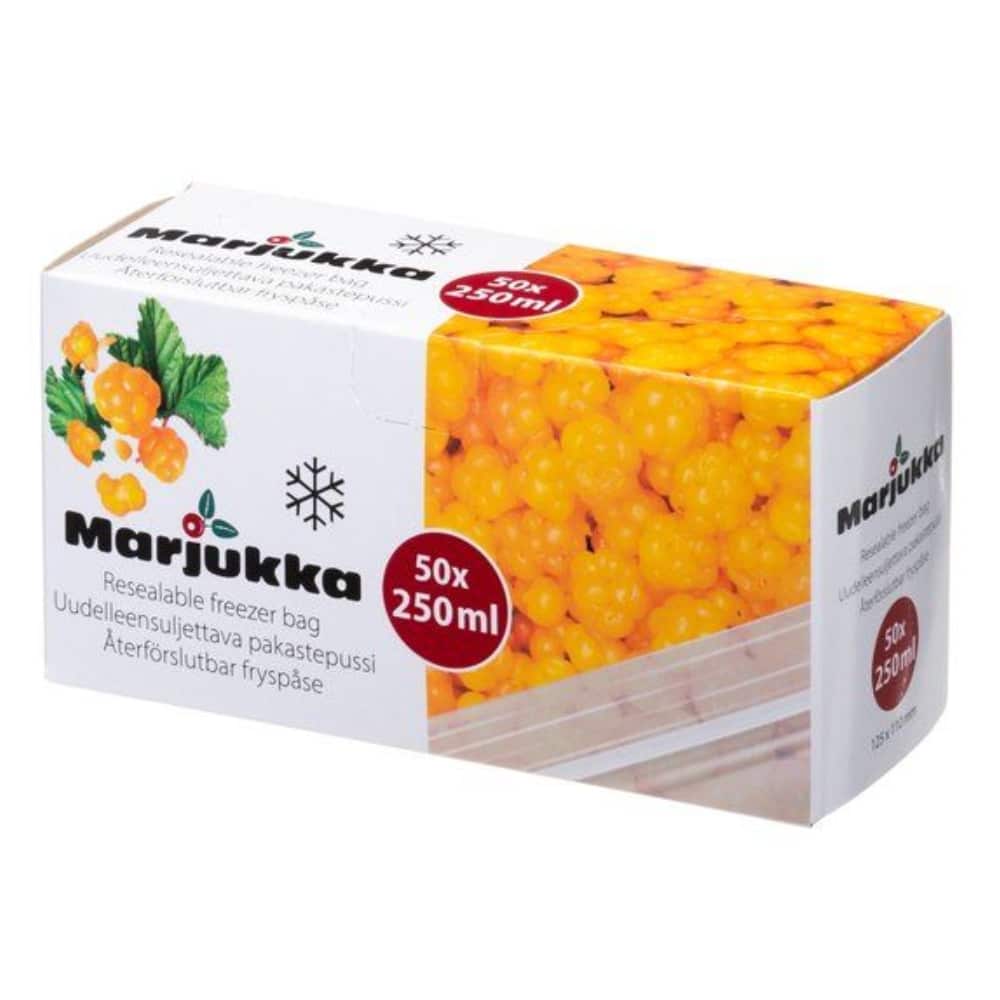 Pakastuspussi sulkijalla Minigrip Marjukka on uudelleensuljettava. Pusseissa on kirjoitusalue.