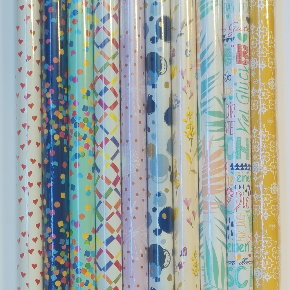 Näissä upeissa lahjapapereissa on useita eri värejä ja kuvioita. Pituudeltaan paperit ovat 200cm x 70cm joka tarkoittaa että niillä pystyy käärimään useamman paketin. Lahjapaperit sopivat hyvin esimerkiksi syntymäpäivälahjojen käärimiseen tai vaikka kirjojen / vihkojen päällystämiseen.