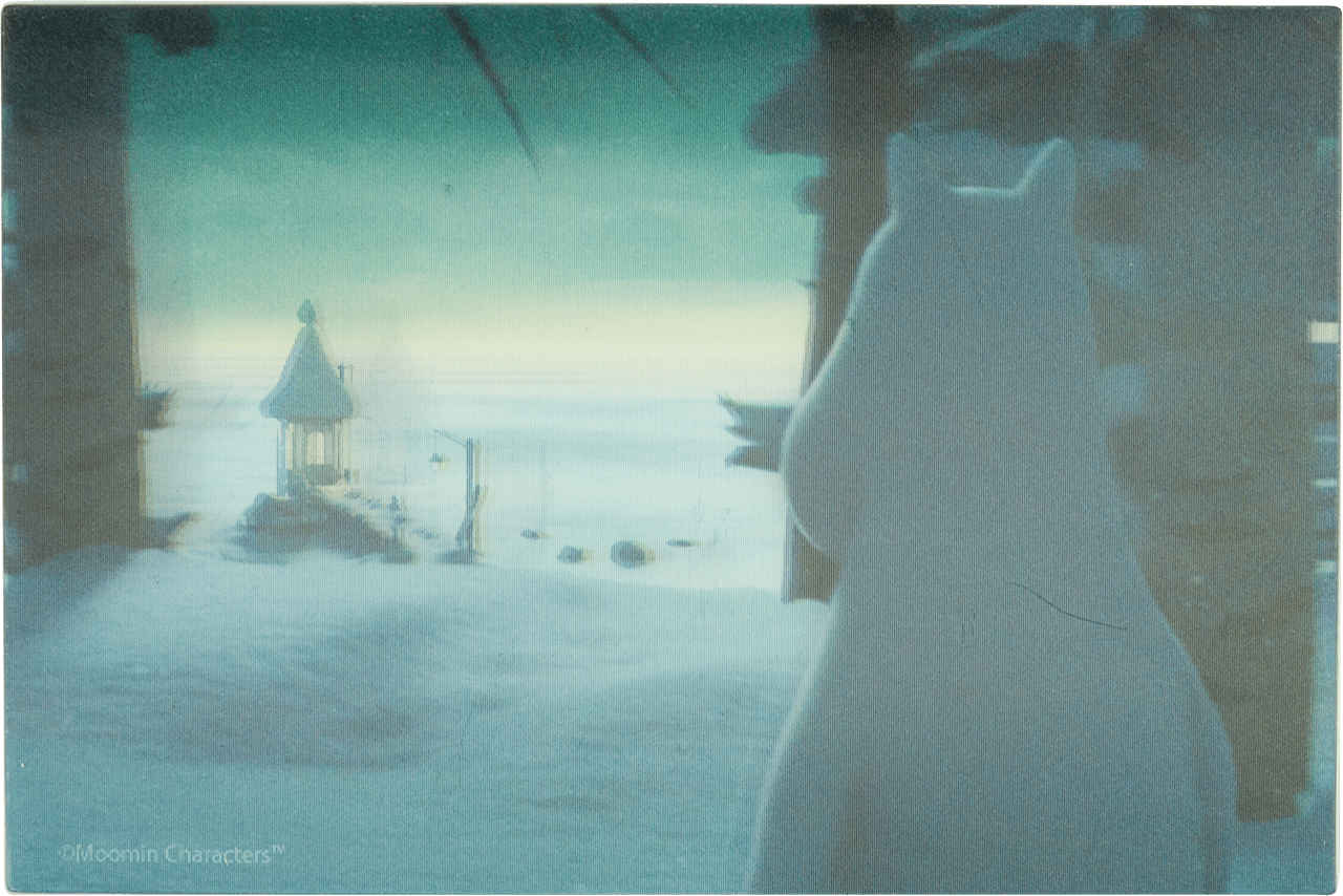 Nyt saapunut valikoimaan hieno 3D postikortti, jossa Muumipeikko katselee uimahuonetta talvella! Lähetä terveiset ystävälle 3D postikortin muodossa!