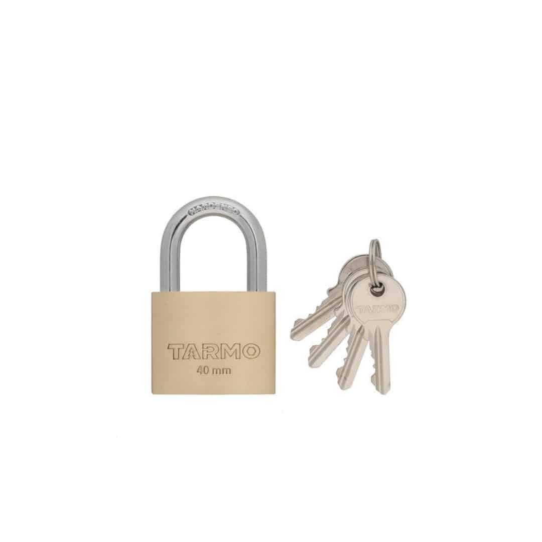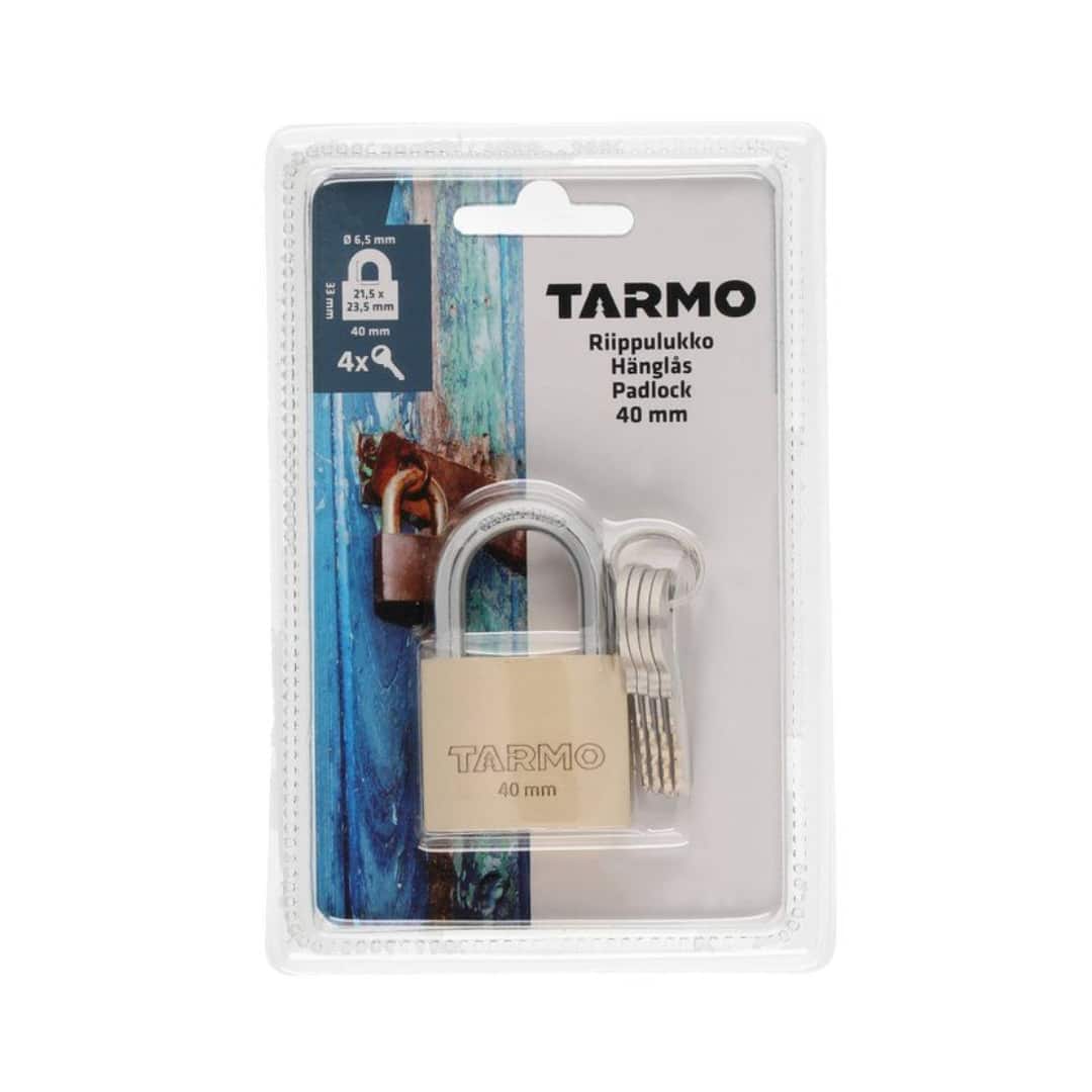 Riippulukko messinki 40 mm – Messinkirunko ja -sylinteri. Sanka karkaistua terästä. Messinkiset haittalevyt ja RST-jouset. Mukana 4 avainta.