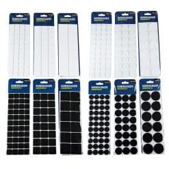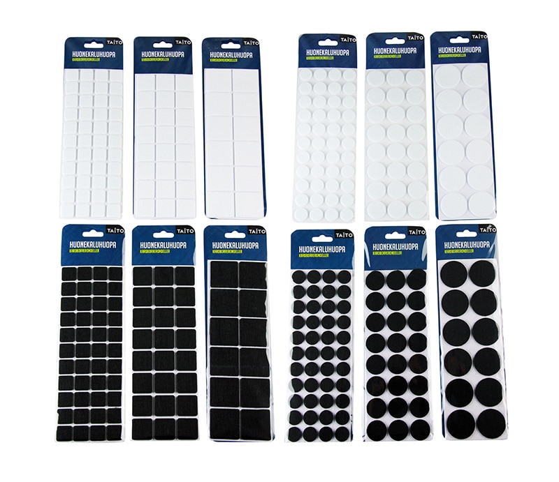 Huonekaluhuovat kiinnitetään huonekalujen pohjaan. Ne vaimentavat tuolien siirtelystä aiheutuvaa ääntä ja säästävät sekä huonekaluja, että lattiaa kulumiselta. Huovat voidaan kiinnittää minkä tahansa huonekalun jalkoihin tai pohjaan. Huovassa on liimapinta, joka pitää sen hyvin paikoillaan. Puhdista ja kuivaa huonekalun pinta ennen huovan liimaamista paikoilleen. Lajitelma sisältää seuraavat kuluttajapakkaukset, jotka ovat kaikki tarjolla mustina ja valkoisina: