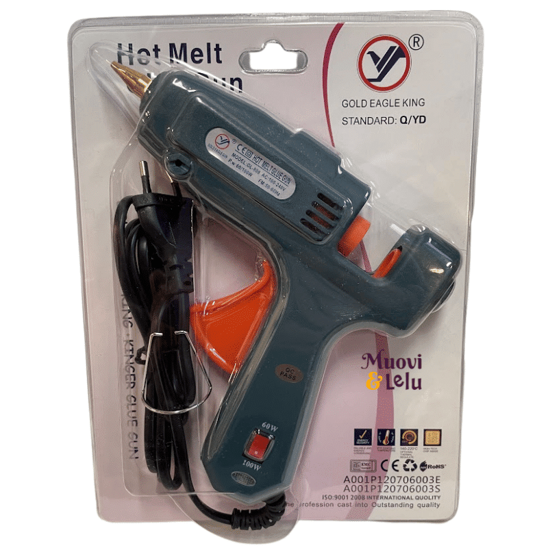 kuumaliima pistooli, jonka teho on säädettävissä 60W, tai 100W. Pyssy saa virtansa pistorasiasta. pyssyyn sopii halkaisijaltaan n. 10mm kokoiset kuumaliima puikot.