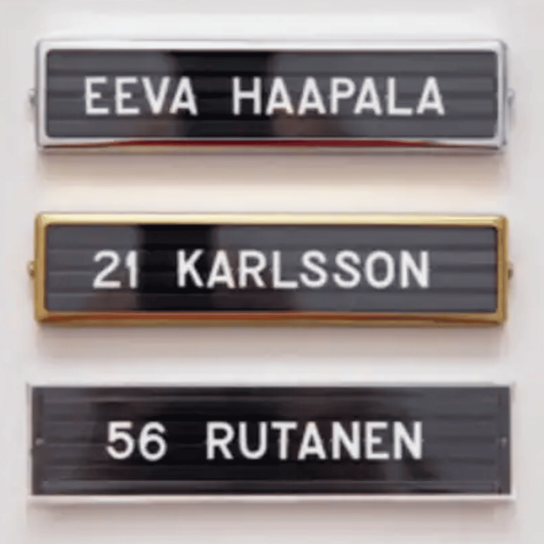 Varakirjain H korkeus 13 mm. Vaihtokirjaimet ovinimikilpiin, porras- ja hinnastotauluihin. Kirjainten väri on valkoinen ja ne ovat muovikirjaimia. Postiluukun kirjaimet. Kerrostalon postilaatikon varakirjain on pieni muovikirjain. Postiluukun tai ilmoitustaulun muovikirjaimet. Vaihtokirjaimet vakiotauluihin ja nimikilpiin.