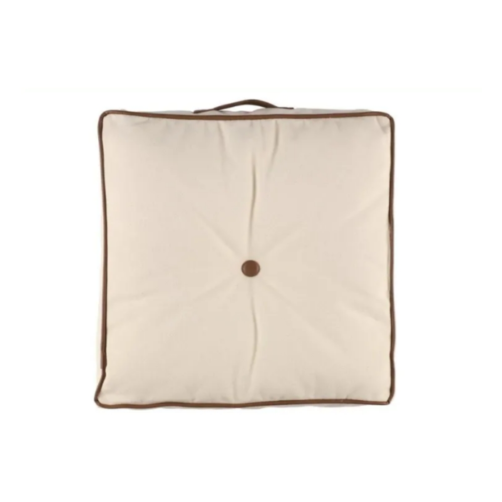 Kaunis kermanvärinen koriste tyyny, jossa on keskellä ja reunassa ruskeat tekonahkaiset yksityiskohdat. Puhdista tahrat kostealla liinalla ja vältä hankausta.