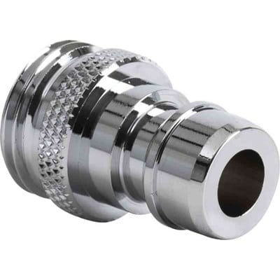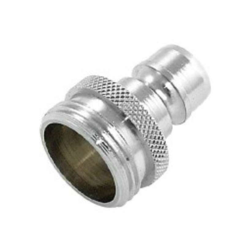 Kestävä metallista tehty letkuliitin yhdistää kaksi letkua helposti. Ulkokierteinen hanaliitin sopii sisäkierteillä varustettuun hanaan.