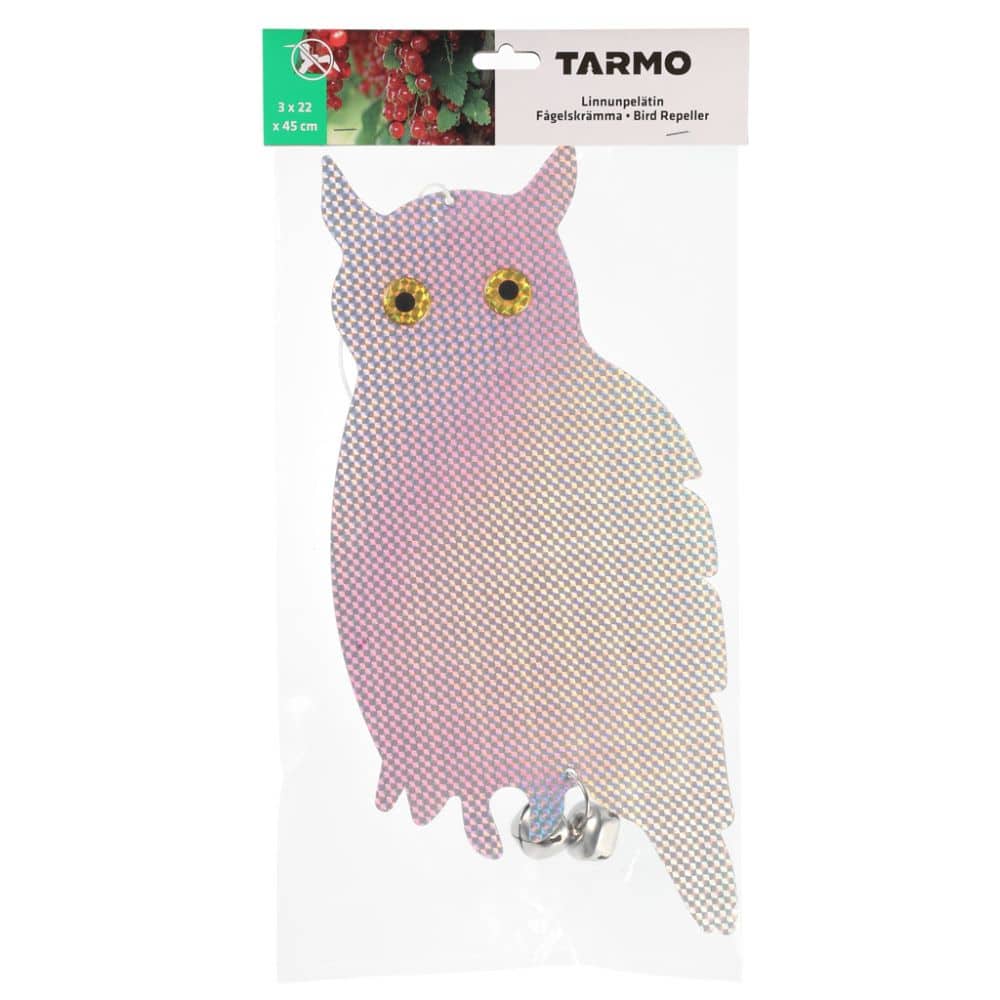Kiiltävä, kilisevä ja heijastava pöllön muotoinen linnunpelätin pitää räkätit pois ryytimaalta ja lokit laiturinnokasta. Sisältää narun ripustusta varten, sekä 2 kpl kulkusia lisäpelotteena. Parhaimman lopputuloksen saamikseksi ripusta kaksi pöllöä pelotteeksi.