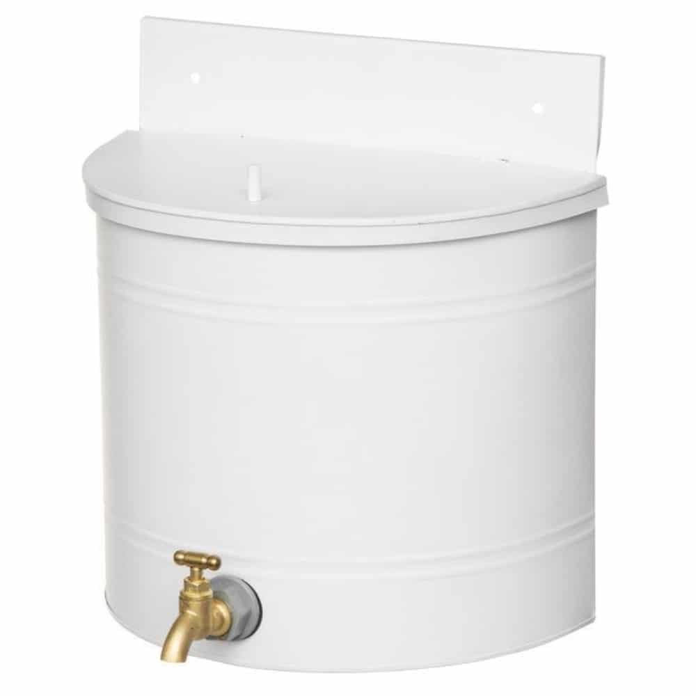 Valkoisen pesusäiliön voi kiinittää seinään. Tämä puutarhan ja kesämökin klassikko soveltuu esim. mökille käsienpesuun, piha-, retki- ja mökkivessaan sekä grillipaikkaan. Ulkoseinään kiinnitettävä vesisäiliö helpottaa käsienpesua touhun tuoksinassa. Säiliön tilavuus on 10 litraa ja se on tehty metallista. Ei sovellu elintarvikekäyttöön.
