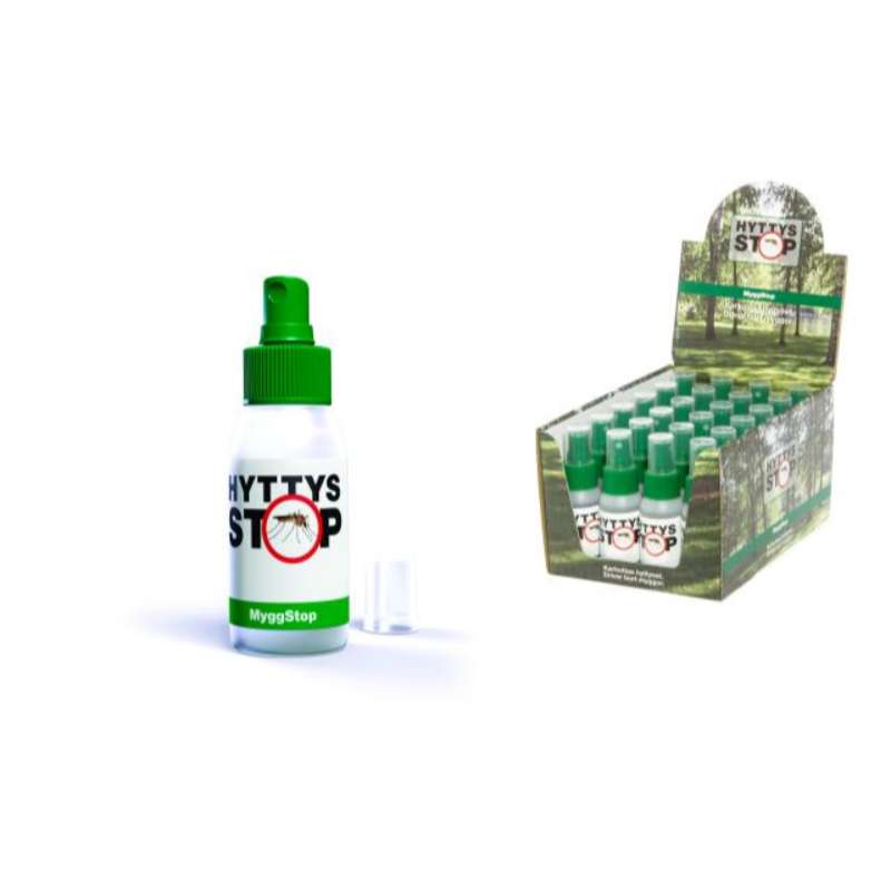 Hyttys stop -sumute karkottaa hyttyset iholta ja vaatteista. Se on hajusteeton karkote, joka antaa tehokkaan suojan kaikkia Etelä- ja Keski-Suomessa esiintyviä hyttyslajeja vastaan. Karkote antaa tehokkaan suojan 2-3 h ajan. Tehoaineena on Icaridin 50 g/kg (Saltidin).