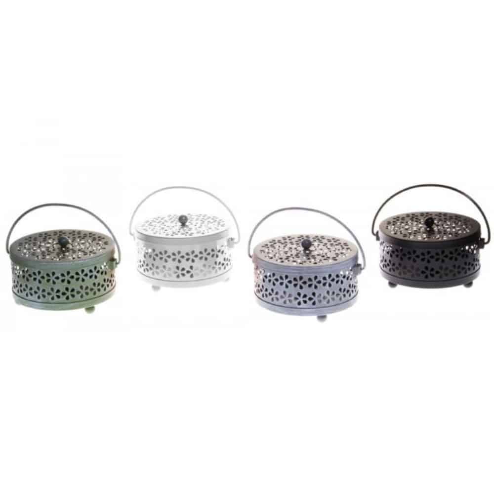 Tyylikkäässä metallisessa hyttyssavunpolttoalustassa on kansi ja kantokahva. Lajitelmassa on neljä eri väriä: vihreä, valkoinen, harmaa tai musta. Polttoalustassa on tyylikäs muotoilu ja kantokahva.