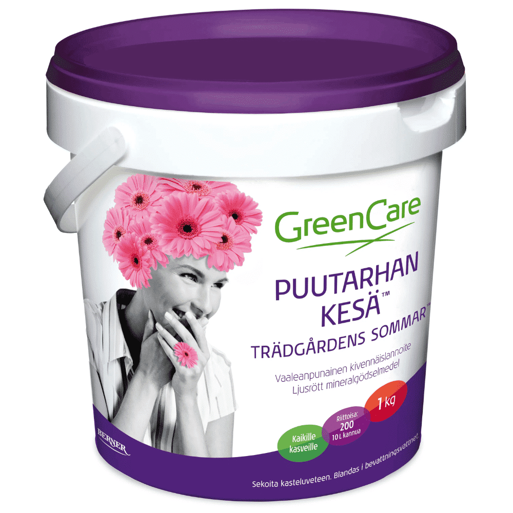 Lannoite puutarhan kesä GreenCare 1 kg punainen on aito ja alkuperäinen, vaaleanpunainen kastelulannoite kaikille puutarhan kasveille. Aito kivennäislannoite, joka sisältää tasapainoisesti kaikkia puutarhakasvien tarvitsemia ravinteita. Antaa kukkiville kasveille näyttävän, pitkäkestoisen kukinnan. Tuottaa kasvimaalla runsaan ja maukkaan sadon. Sopii myös huonekasveille ja orkideoille.