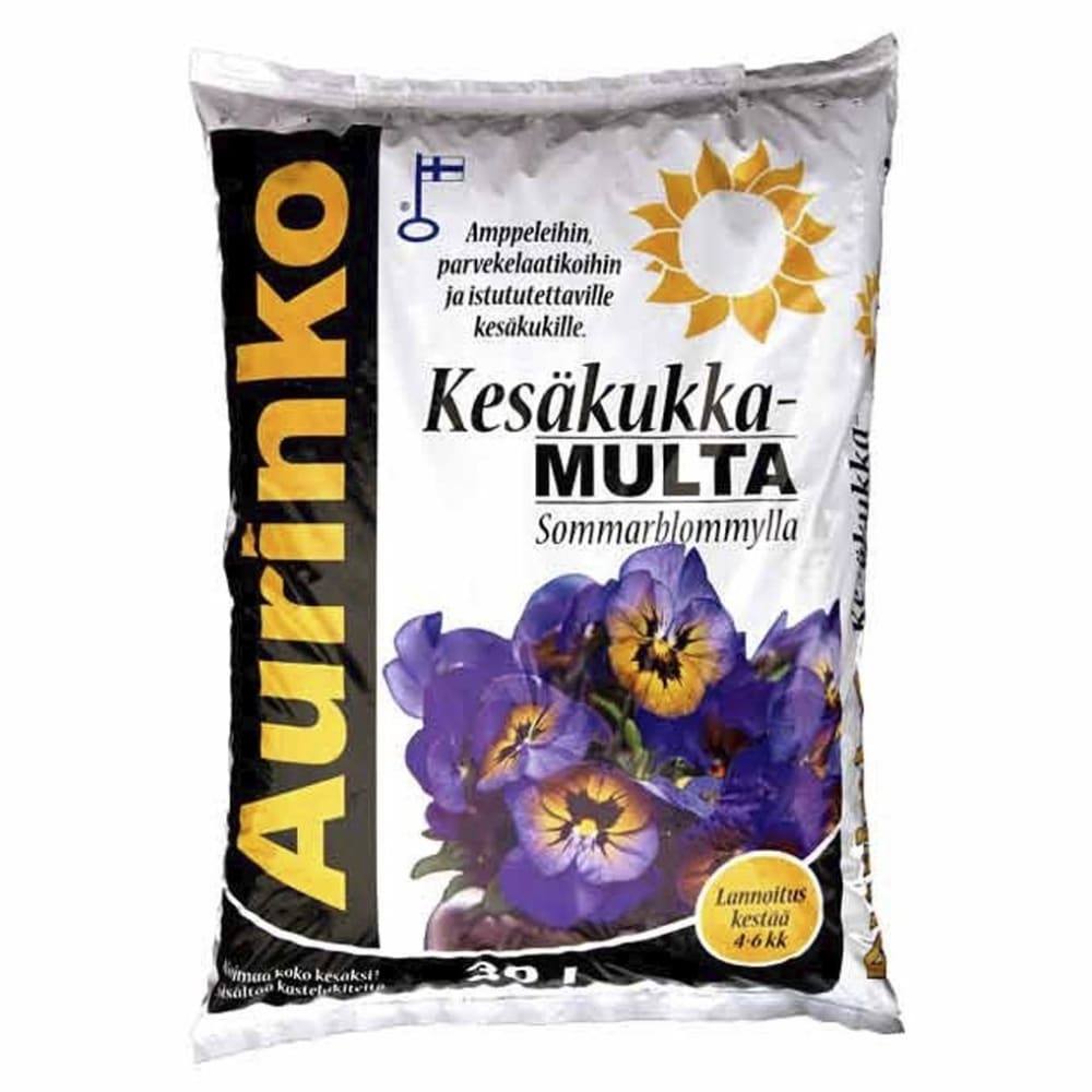 Multa kesäkukkamulta Aurinko 30 l on erikoismulta kesäkukille, amppeleihin, parvekelaatikoihin, ruukkuihin ja istutettaville kukille. Kastelun helpottamiseksi multaan on lisätty kastelukiteitä, jotka auttaa pitämään mulla kosteana pitempään. Normaalin lannoituksen lisäksi multaan on lisätty pitkävaikutteinen lannoite.