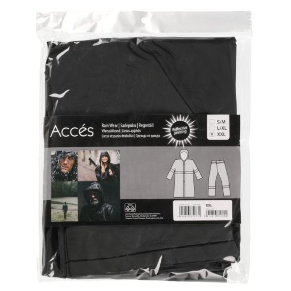 Käytännöllinen sadeasu sisältää pitkänmallisen sadetakin ja housut.