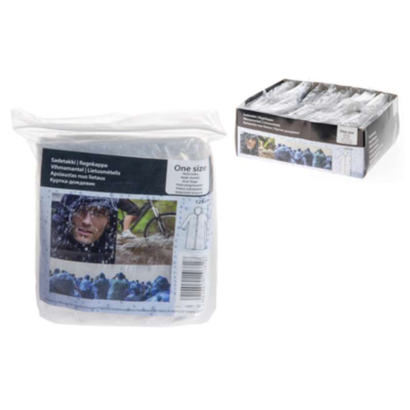 Edestä napitettava kevyt sadetakki hupulla. Pituus 125 cm. PE muovia.