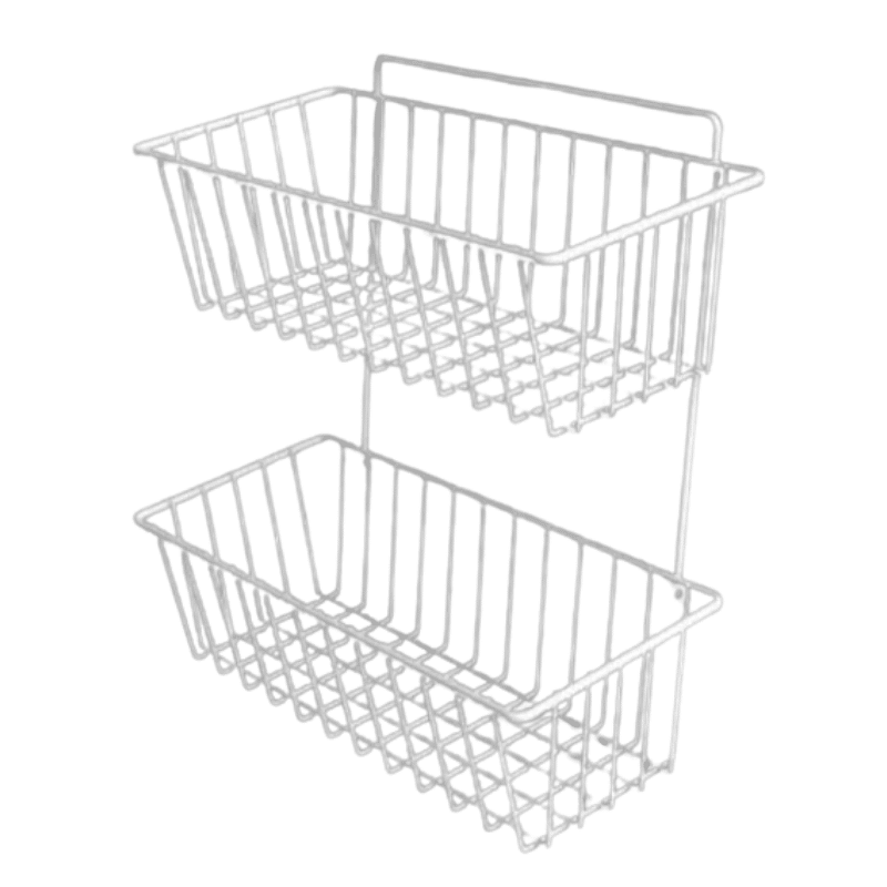 Koriteline, jossa on kaksi koria. Valkoinen laadukas, suomalainen koriteline, jossa on kaksi tukevaa koria. Kiinnitys ruuveilla seinään tai oveen. Valmistettu Suomessa korkealaatuisesta teräslangasta.