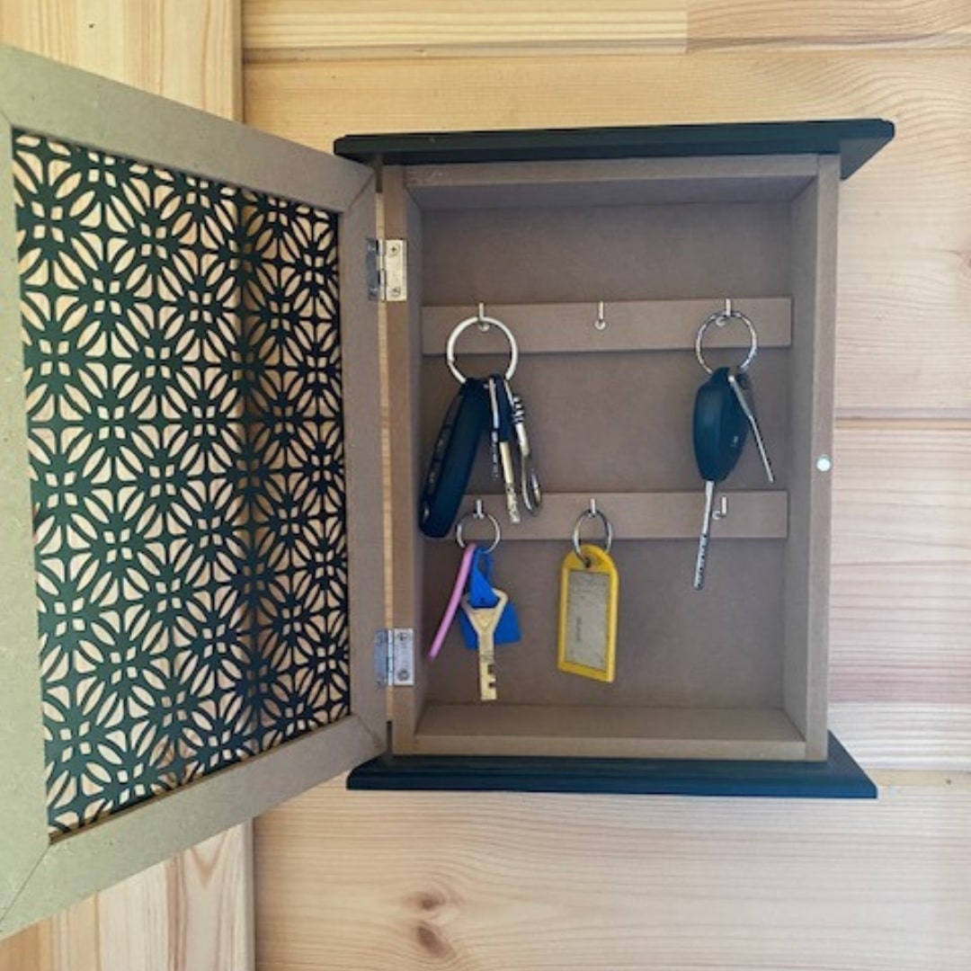 Tyylikäs avainkaappi avainten säilyttämiseen. Kaapissa on kuusi koukkua ja sen materiaali on puuta ja rautaa. Kaappi menee itsestään kiinni magneetin avulla. Avainkaapin voi laittaa myös halutessaan roikkumaan seinään.
