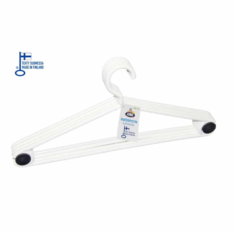 Aino vaateripustin on perinteikäs, muovinen henkari vaatteiden säilytykseen. Malli on saatavilla mustana ja valkoisena. Kevyt sekä kapea ripustin mahtuu pieneen tilaan. Pakkaus sisältää neljä ripustinta. Valmistettu Suomessa. Materiaali: 100 % kierrätysmuovi Suomalainen Avainlipputuote. Paino: 0,222 kg Yksikkökoko: 1 x 14 x 40 cm Koko: 4 x 14 x 40 cm