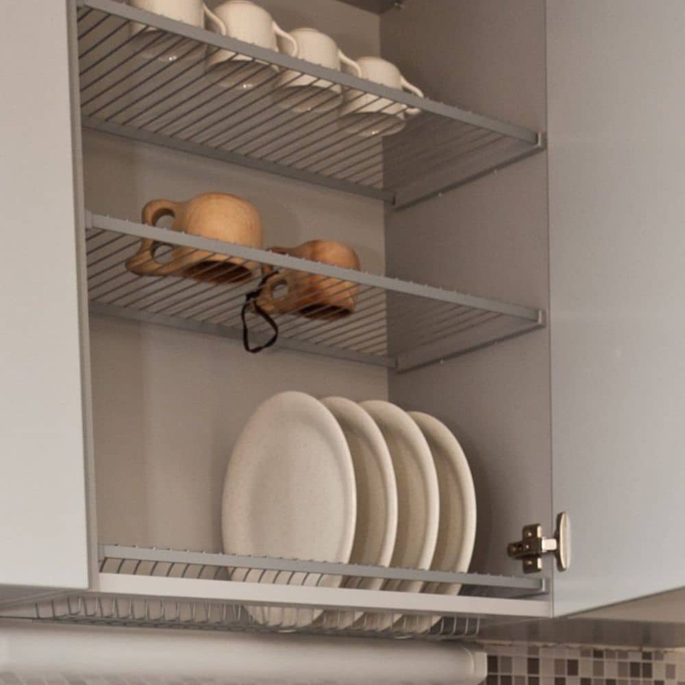 Kuivauskaapin ritilä 1165 mm lautashylly – Ritilämme soveltuvat useimpien kaappien vanhoihin kannakkeisiin. Huomioithan kuitenkin, että kannakkeiden soveltuvuudessa saattaa olla mallikohtaisia eroja. Jos teidän nykyinen astiakaapin ritilä on sellainen malli, jossa on päädyssä myös pinna/päätyrauta, niin silloin teidän tulisi todennäköisesti hankkia kannatin pari, koska näissä uusissa ei ole päätypinnaa.
