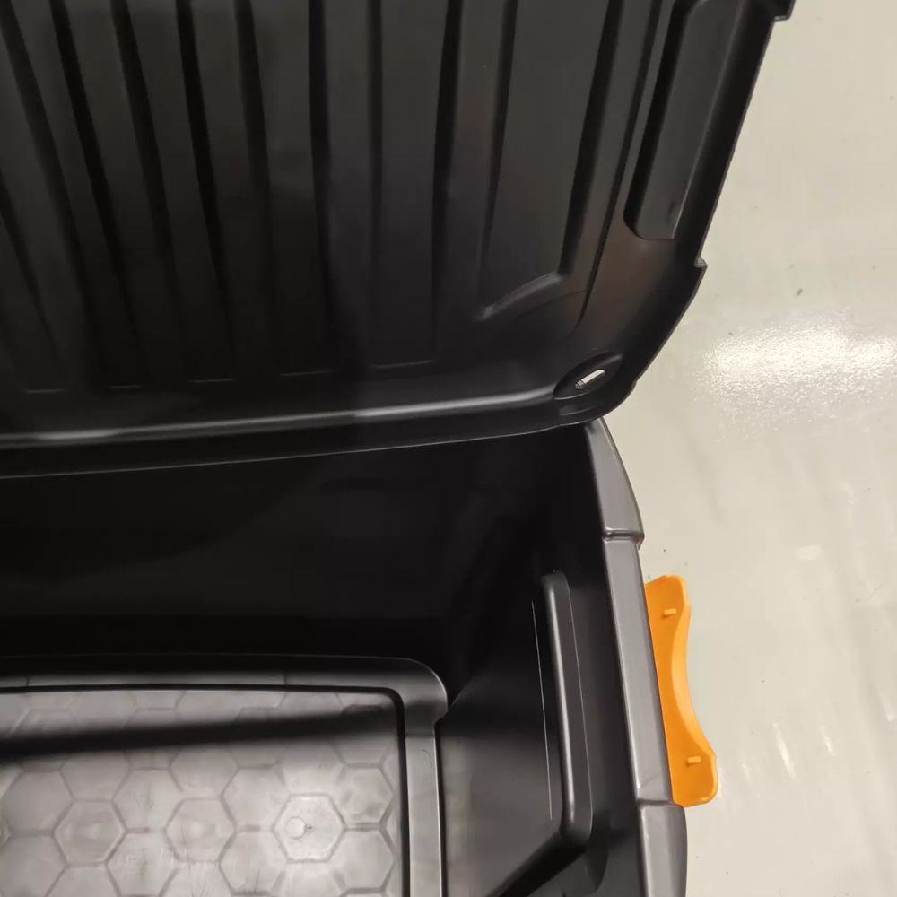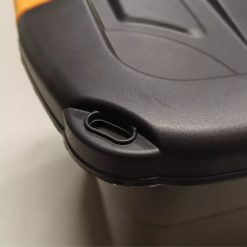 Mustassa laatikossa on tukevat keltaiset kannen kiinnikkeet, joiden avulla kansi pysyy tiiviisti paikoillaan.