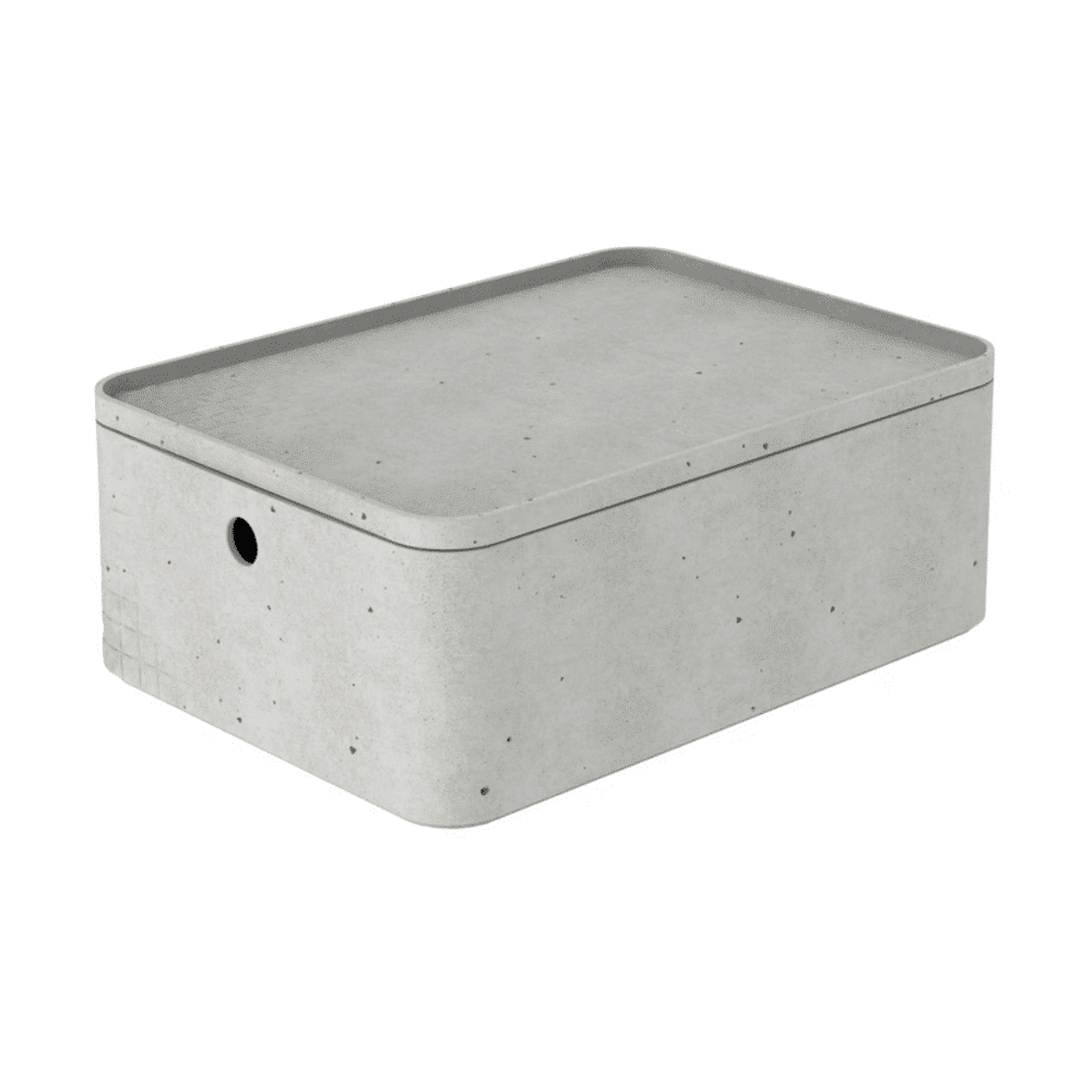Curver kannellinen säilytyslaatikko. Curverin säilytyslaatikko on aidolta betonilta näyttävä materiaali, vaikka se on oikeasti polypropeenin ja mineraaliyhdisteen sekoitus. Laatikon kulmassa on ruutumainen painokuvio. Pinottavan laatikon päissä on pienet kantoreiät.