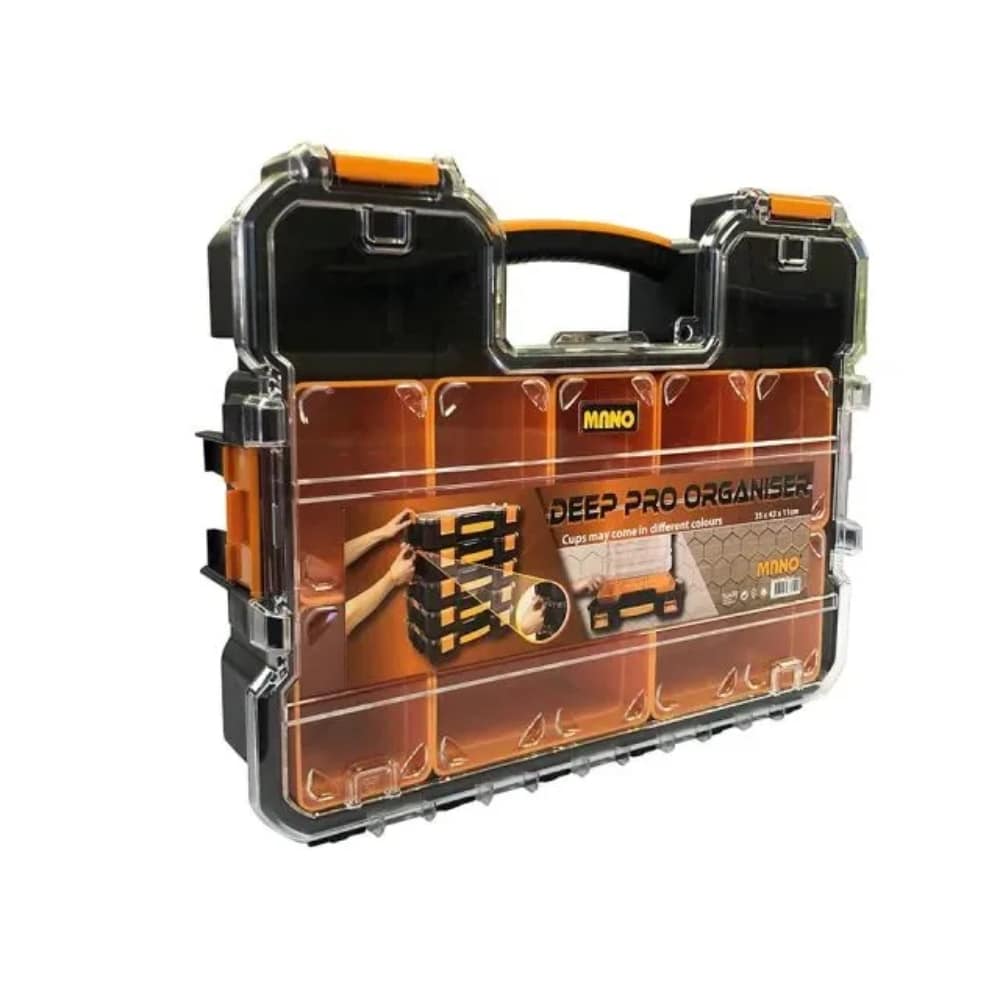 Tällä ammattimaisella lokerikolla on syvä muotoilu ja kirkas kansi sisällön tunnistamiseksi helposti. Salkkutyyli mahdollistaa helpon kantamisen ja turvallinen kansi estää tavaroiden liikkumisen. Irrotettavat kupit mahdollistavat monenlaisia muotoja ja kokoja. Tämä lokerikko sopii erinomaisesti naulojen, ruuvien ja muiden tee-se-itse-tarvikkeiden säilyttämiseen yhdessä paikassa.