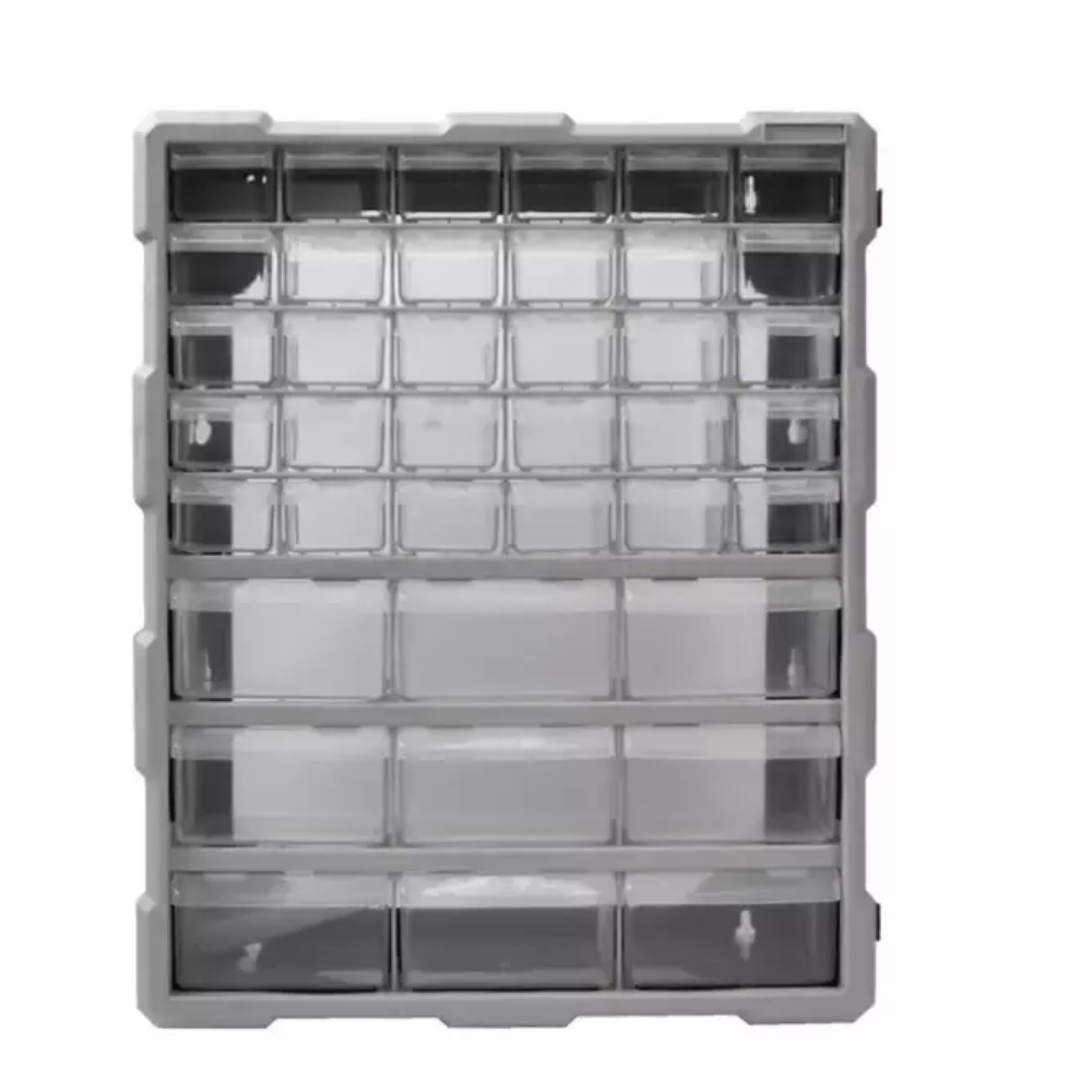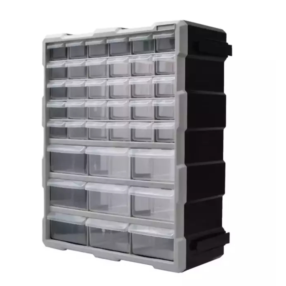 Lokerikko sisältää yhteensä 39 kirkasta laatikkoa, joista 30 on pienempiä ja 9 suurempia. Pienet laatikot (11 x 5 cm) sopivat esimerkiksi ruuveille ja nauloille, kun taas suuremmat laatikot (11 x 14 cm) ovat täydellisiä suuremmille osille, kuten liittimille, varaosille tai työkalujen lisäosille. Kirkkaiden laatikoiden ansiosta näet helposti laatikoiden sisällön ilman, että niitä tarvitsee avata erikseen – tämä säästää aikaa ja helpottaa oikean osan löytämistä nopeasti.