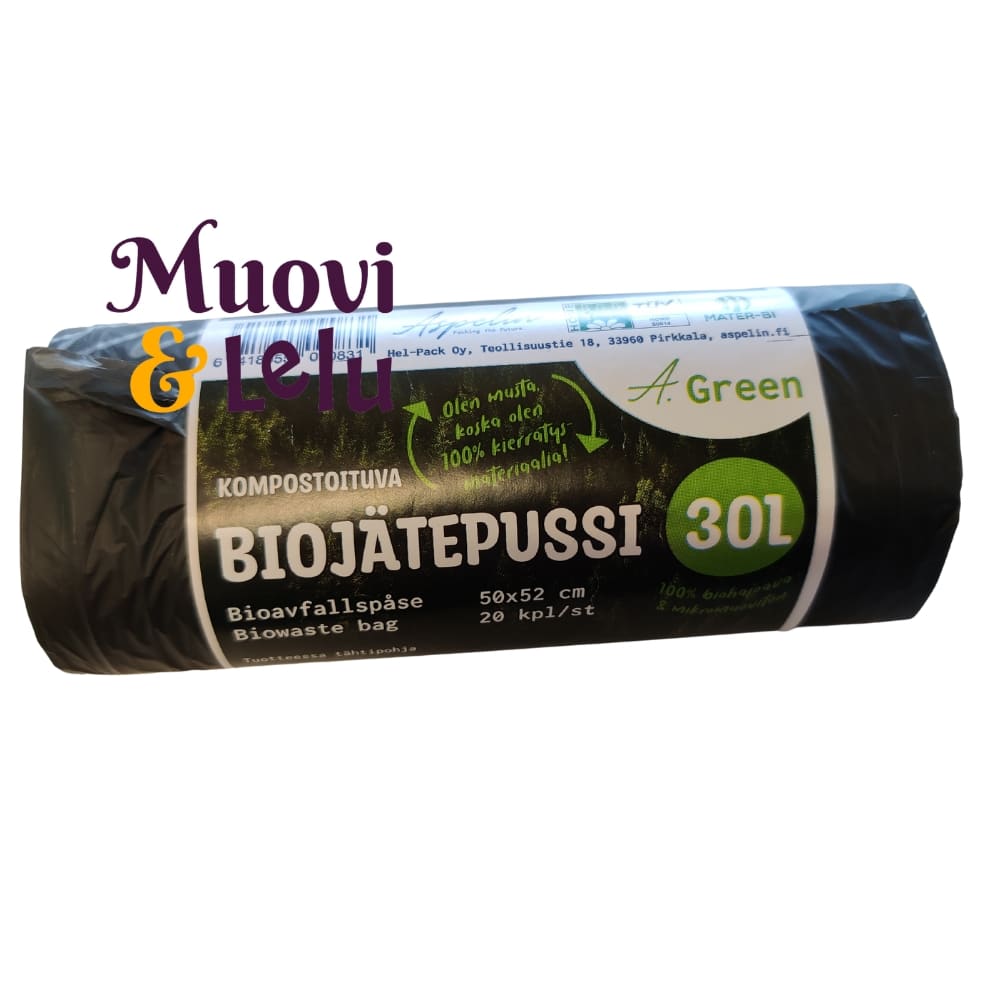 Jätepussi bio kompostoituva 30 L 20 kpl on kotikompostissa maatuva biojätepussi. Koko: 50×52 cm. Mukana tulee 20 kappaletta 30 litran pusseja. 100 % biohajoava ja mikromuoviton.