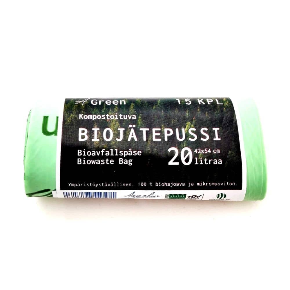 A. Green biojätepussi kotikompostiin 20 litraa. Koko 42×54 cm, vahvuus 15 my. Valmistettu sertifioidusta kotikompostissa hajovasta mater-bi bio kalvosta. Rullassa 15 kpl.