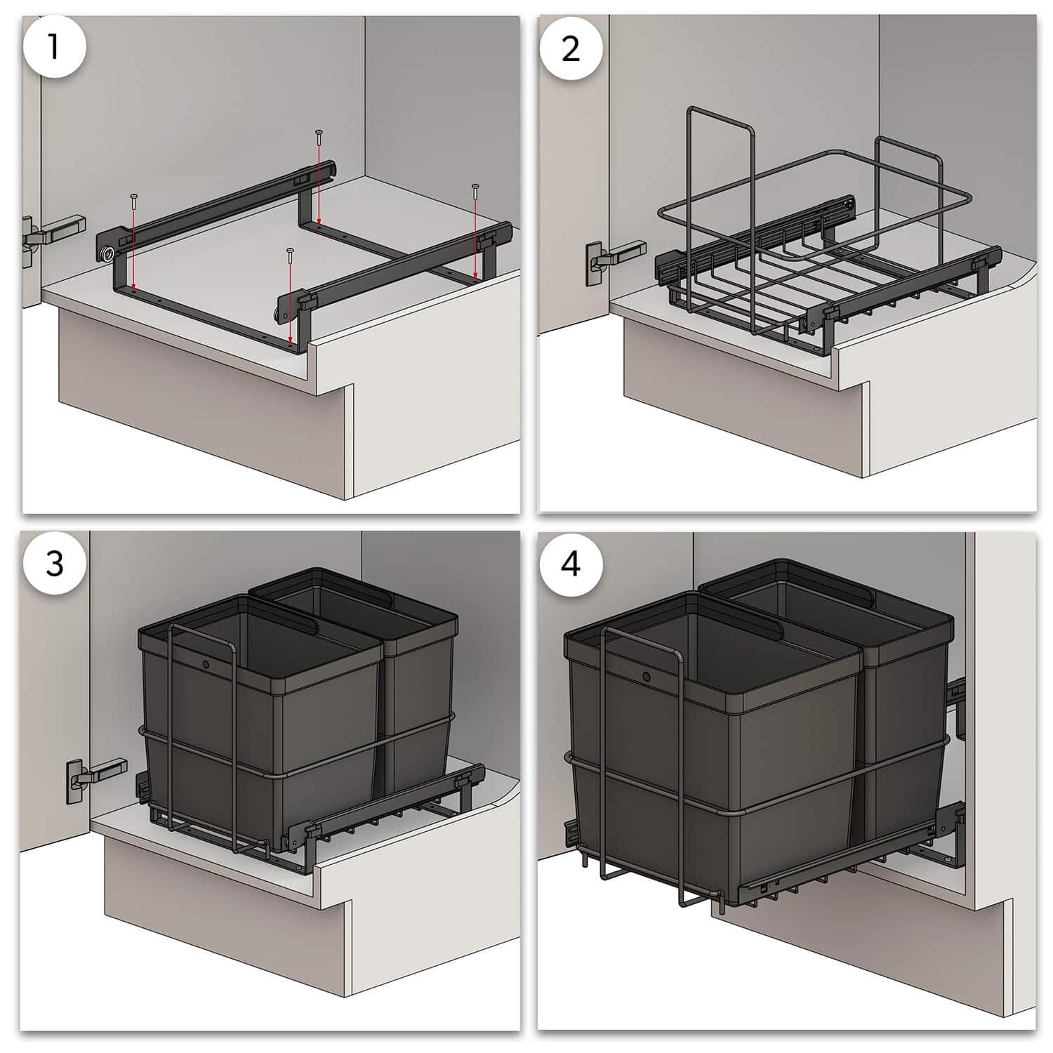 Pakkaus sisältää 1 kpl 16 L sankoa (LM 531) ja 1 kpl 11 L sankoa (LM 533) sekä asennusruuvit. Asennus on helppoa ja nopeaa: kiinnitys ruuveilla kaapin pohjalevyyn ja vaunu on heti käyttövalmis. Soveltuu tilaan, jonka vapaa leveys min. 330 mm. Jätevaunuun sopii avausmekanismi LM 119 sekä paristoroskis LM 524, jotka voidaan hankkia erikseen lisävarusteena. Avaavan kaaren avulla jätevaunu tulee kaapista automaattisesti ulos ja menee takaisin sisään ovea käytettäessä. Avausmekanismi lisää myös vaunun käyttöikää.