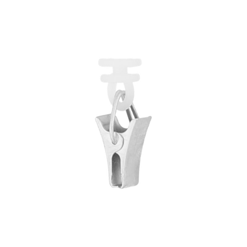 Pyöreä liuku U-kiskolle. Metallinen ja metallin värinen nipistin, vaalea muovinen liuku.