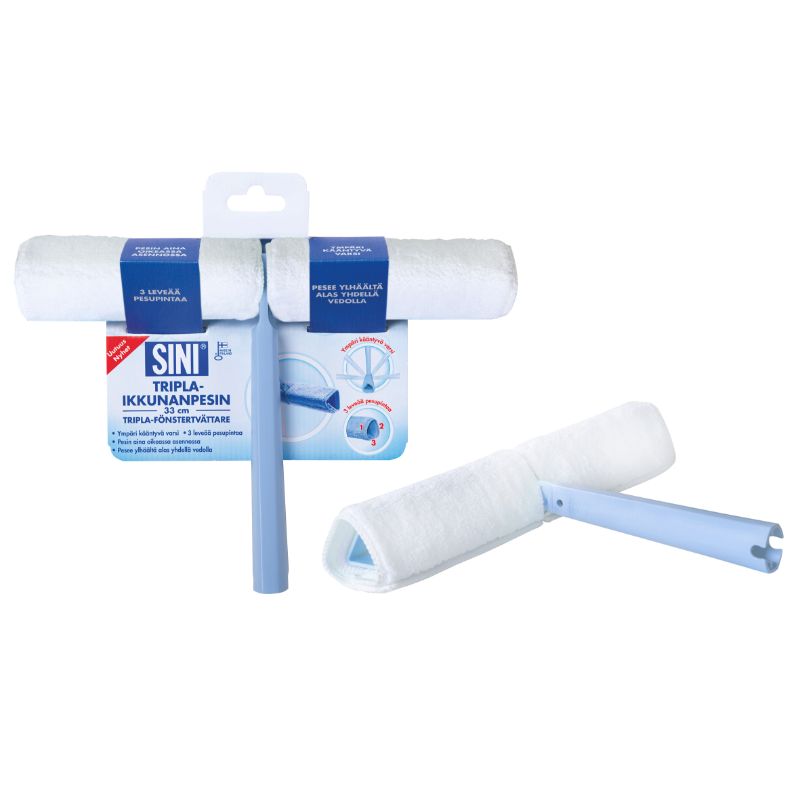 Ikkunanpesin tripla Sini on laadukas suomalainen tuote. Tripla-ikkunanpesin kääntyy lähes 360 astetta, jolloin se on aina oikeassa kulmassa pestävää ikkunapintaa vasten. Tripla-ikkunanpesimellä kaikenkokoisten ikkunoiden pesu sujuu vaivatta. Kolmionmallisen ikkunanpesimen kolme pesupintaa tehostavat työskentelyä. Mikrokuituikkunanpesimellä saa säihkyvän puhdasta jälkeä jopa pelkällä vedellä. Mikrokuituinen päällinen kiinnitetään ikkunanpesimen runkoon tarranauhojen avulla. Ikkunanpesin sopii kaikkiin SINI-välinevarsiin. Tripla-ikkunanpesin on Suomessa valmistettu avainlipputuote.