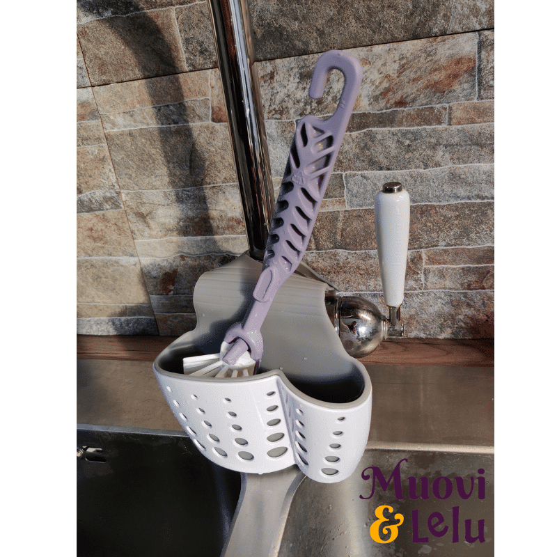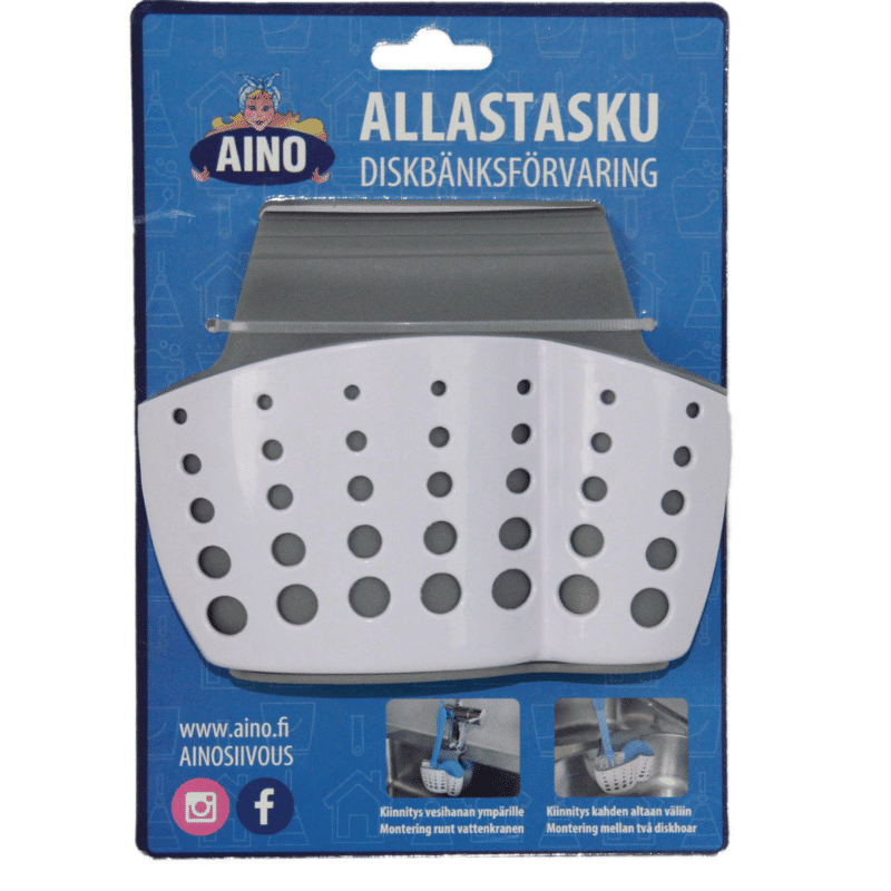 Aino allastasku helpottaa tiskiharjan ja erilaisten keittiösienien kuivaamista ja säilyttämistä. Tasku suojaa kuivuvia siivousvälineitä vesihanan roiskeilta. Sen pohjassa on reikiä, joista vesi valuu pois. Taskusta on helppo nostaa tiskausvälineet käyttöön.