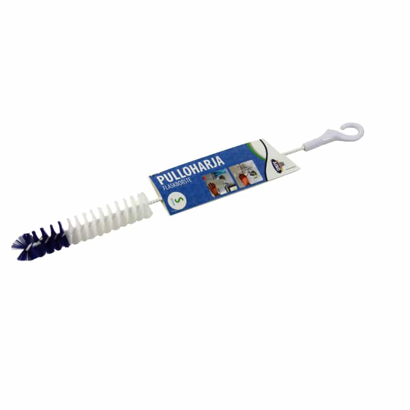 Aino pulloharjan sinivalkoiset nylonharjakset puhdistavat erikokoiset pullot.