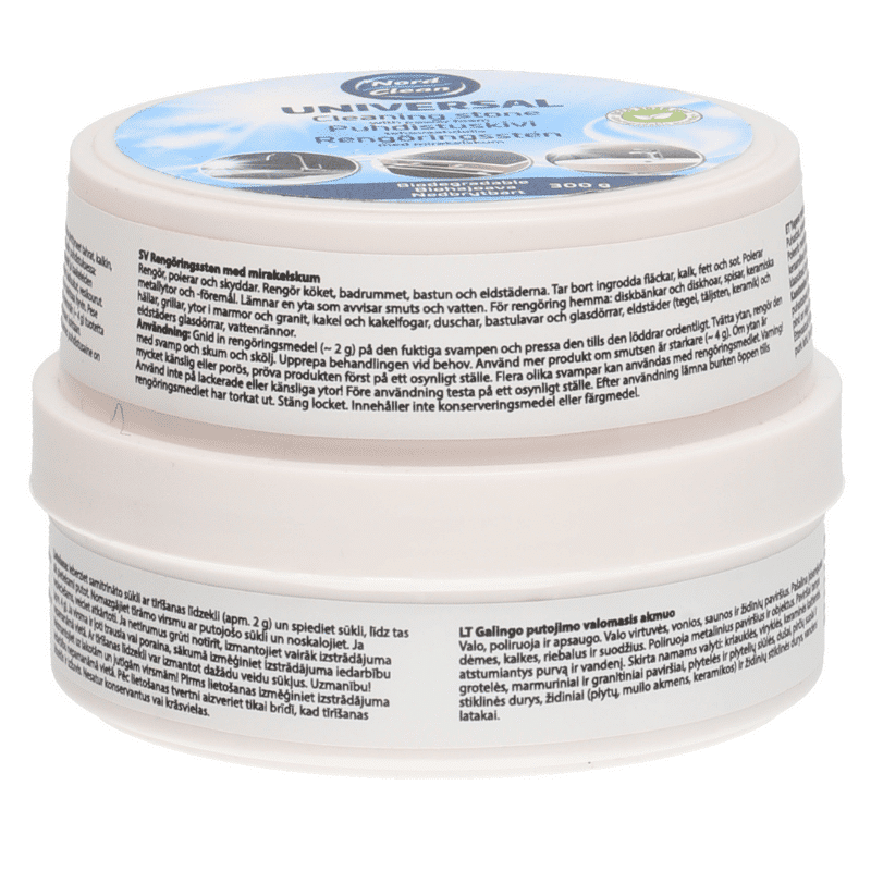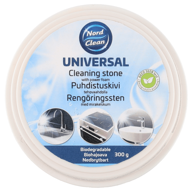 Pesuaine puhdistuskivi Nord Clean – Puhdistaa, kiillottaa ja suojaa tehokkaasti ja turvallisesti. Poistaa pinttyneet tahrat, kalkin, rasvan ja noen. Jättää likaa ja vettä hylkivän pinnan. Sopii useimmille kodin pinnoille. Pakkaus sisältää pesusienen. Raikas sitruunan tuoksu.